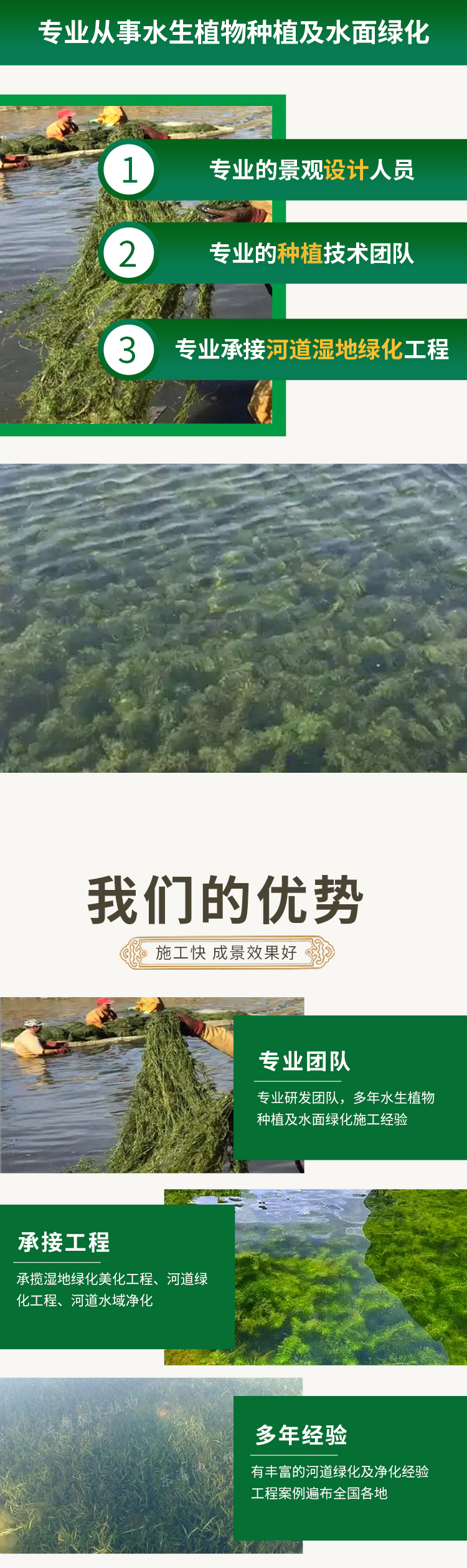 生长习性:耐寒矮生苦草根据水深进行自身高度调节生长的功能,水下景观效果较好、永不长出水面、无需要收割的优点、比较耐寒,离水面20cm以下,可耐寒零下20度不死,耐严寒酷暑,四季常青。